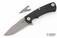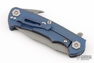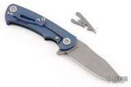 This Project X Flipper by Rick Hinderer Knives features a stonewash finished blade, notched thumbrest and flipper, dual thumbstuds. The handle has a blackG-10 scale, and battle blue finished titanium frame with matching clip. Nice lockup, seating, and detent. Comes with original box and extra washers. Excellent Condition.