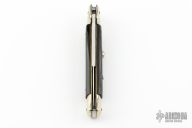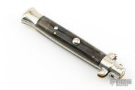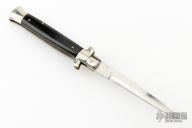 This Picklock Auto features a satin finished bayonet ground blade with false top edge. The handle has nickel silver bolsters and pommel with buffalo horn scales over d-stamped brass liners and steel backspacer. Has scratches, has been resharpened, otherwise good condition. This one is marked "M. ITALY INOX"