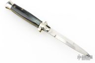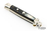 This pick lock auto by AGA Campolin features a mirror polished blade with a false top edge. Nickle silver guard and rear bolster, buffalo Horn scales, brass d-stamp liners and stainless steel backspacer. Nice function, strong firing. Excellent Condition.