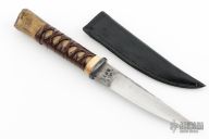 This Tanto from Mastersmith Aaron Wilburn of Wilburn Forge features a forged blade with nice gamon and a hand rub satin finish, .154" blade stock and .942" blade depth, hidden tang construction. The handle has a forged steel guard, oosik grip with leather wrap, mammoth ivory spacer. Includes leather sheath. Has a couple light scratches, otherwise excellent condition. #567. Comes with a zippered case.