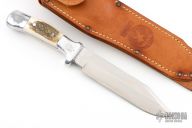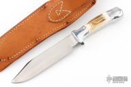 This M Stamp Model 25AC Custom Workman by Rudy Ruana knives features a satin finished clip point blade with sharpened top edge, .163" blade stock and 1.251" blade depth, hidden tang construction. The handle is cast from aluminum with stag inserts. Comes with brown leather sheath and a zippered case. Has a few scratches, otherwise excellent condition.