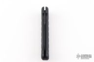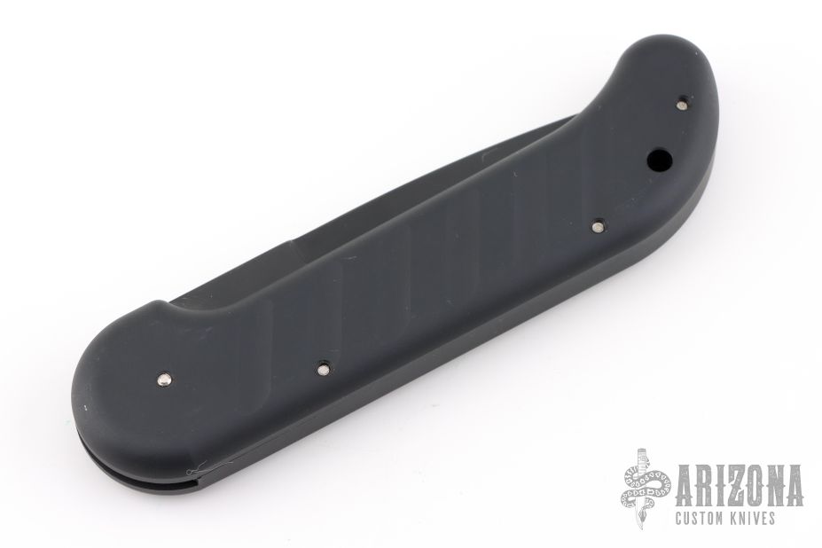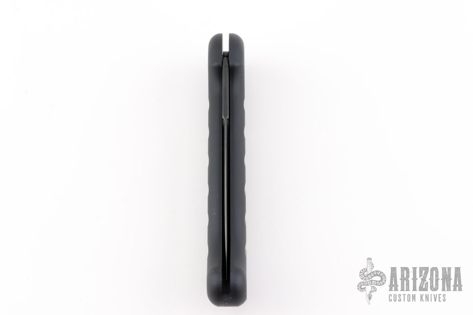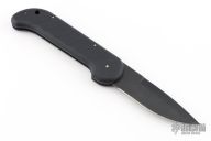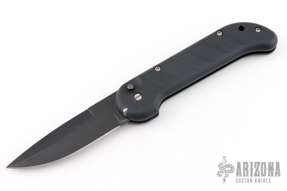 This Ron Miller/Charles Ochs coil-spring automatic features a black blade and black anodized aluminum frame. Strong and fast opening. Nice function. Comes with original signed box. Has some light scuffs and a white spot on the handle near the blade, good condition otherwise.