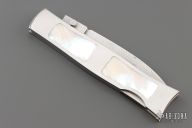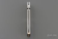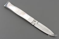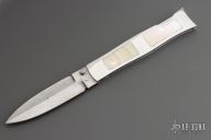 This Interframe Lockback folder by Charles H Morris features a Damascus blade with a false top edge and dual checkered thumbstuds. The handle has a high satin finished stainless steel frame with mother of pearl inlays, stainless steel and ivory paper micarta backspacer. Has nice lockup and blade seating. Has some light scratches, otherwise excellent condition.