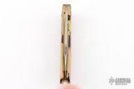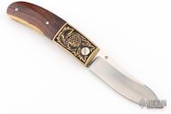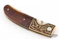 This Linerlock by Michael Walker features a hand rub satin finished blade with mirror polished flats, single checkered thumbstud. The handle has anodized and dovetailed titanium bolsters that have been engraved by Patricia Walker, desert ironwood scales, anodized titanium liners and backspacer. Nice lockup and blade seating, this knife was made before Michael invented the Detent. A-Side of the blade is marked "Walker's Lockers by ML Walker". Has a couple light scratches, otherwise excellent condition.