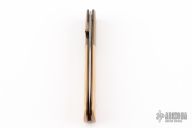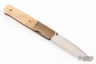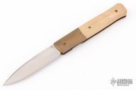 This left handed Linerlock by WD Pease features a hand rub satin finished blade with a single thumbstud. The handle has blasted and anodized titanium bolsters, mammoth ivory scales, anodized titanium liners and backspacer. "W2M14" on blade. Nice detent, lockup and blade seating. Excellent condition. Comes with original invoice dated 5/7/90