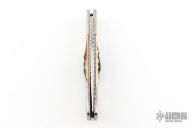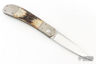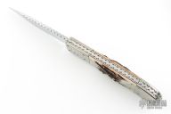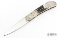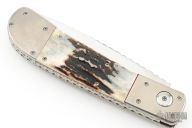 This Scale/Palm Release Auto by Crawford Knives features a mirror polished blade with fileworked spine. The handle has dovetailed titanium bolsters, stag scales with red liners, fileworked titanium liners, fileworked stainless steel backspacer. Has some light scratches, otherwise excellent condition.
