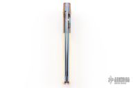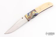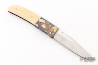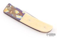 This Linerlock by Michael Walker features a hand rub satin finished blade with mirror polished flats, single checkered thumbstud. The handle has anodized and dovetailed titanium bolsters, white bone scales, anodized titanium liners and backspacer. Nice detent, lockup and blade seating. A-Side of the blade is marked "WL" for Walker's Lockers. Has a couple light scratches, otherwise excellent condition.
