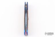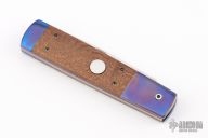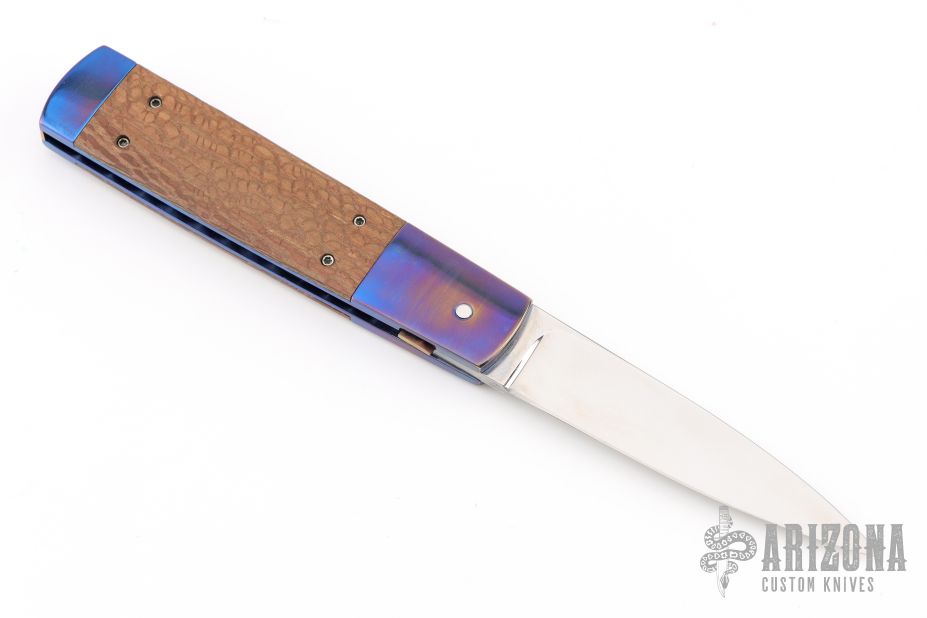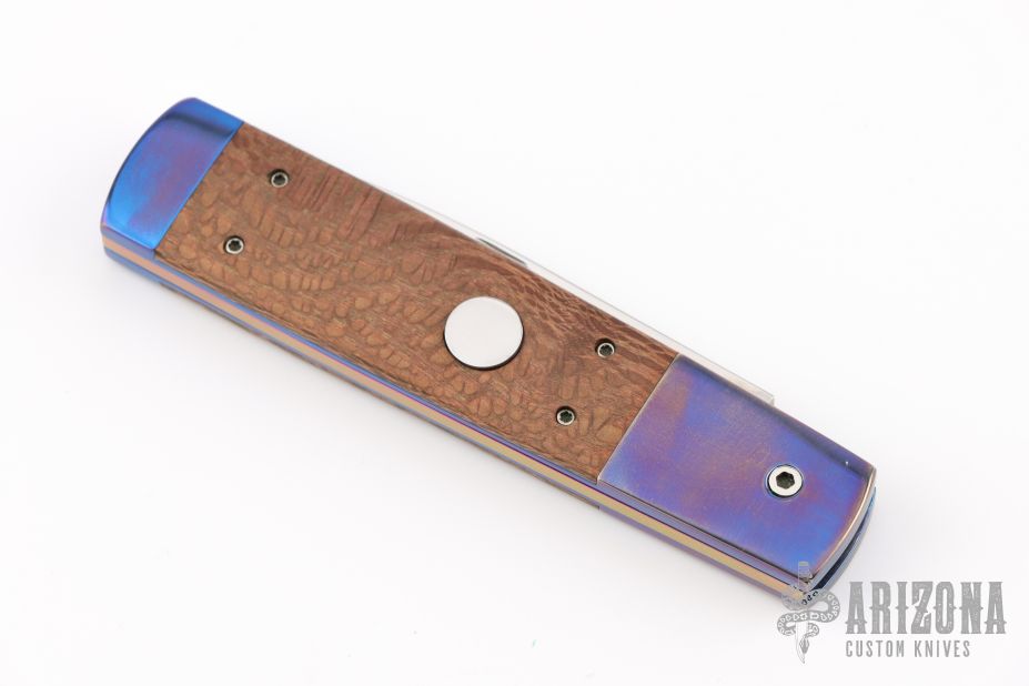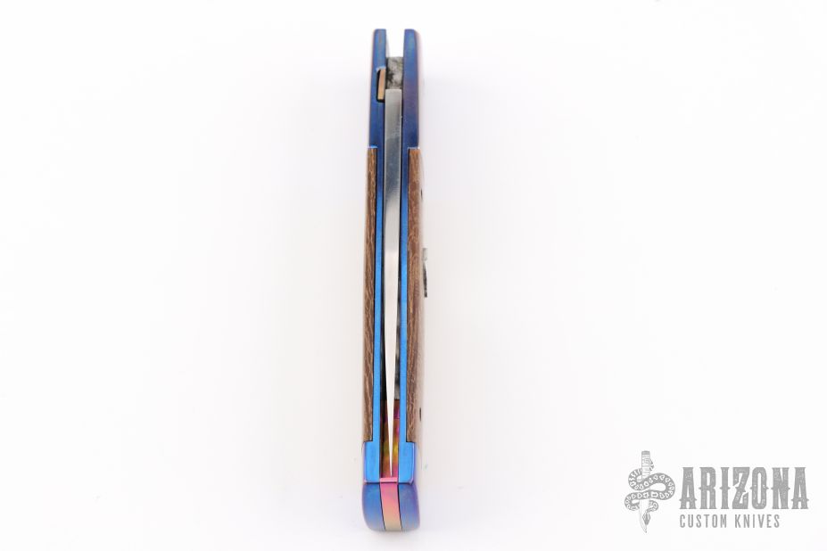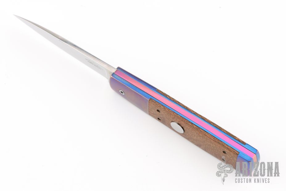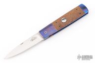 This D/A Automatic by Butch Vallotton features a mirror finished drop point blade with nail nick. The handle has anodized titanium bolsters, lace wood scales, anodized titanium liners with jeweled interiors, anodized titanium backspacer. Has a couple light scratches, otherwise excellent condition. Nice lockup and action. Comes with original sales receipt dated June 21, 1991