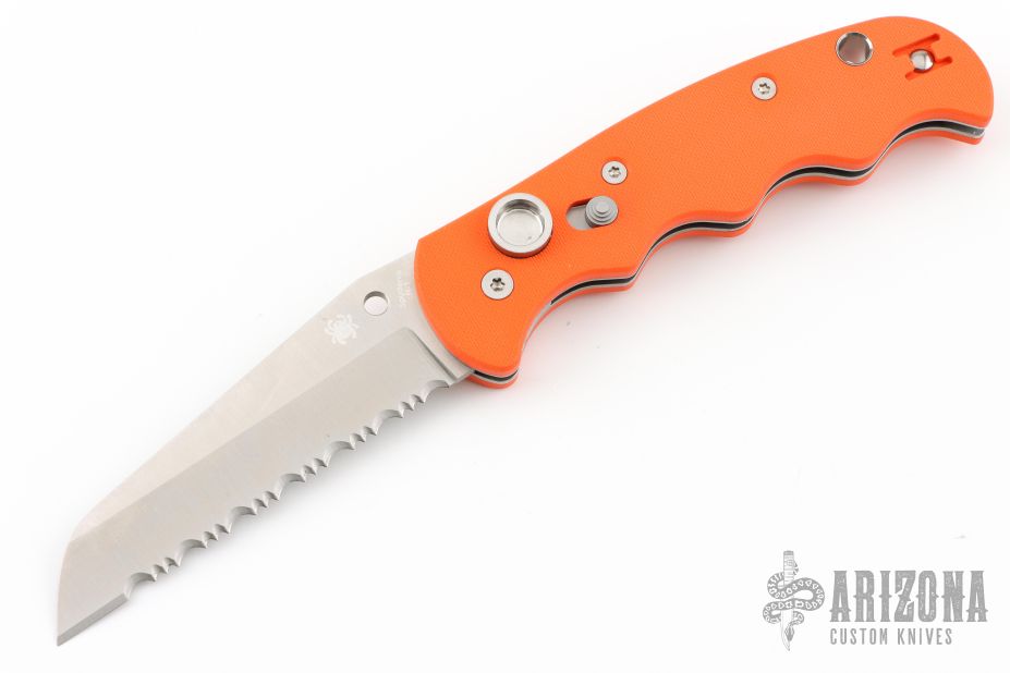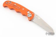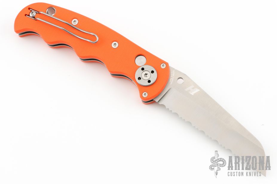 This Spyderco Autonomy features a satin finished fully serrated blade, H-1 Blade steel. The handle has orange G-10 scales, stainless steel liners, and a tip up reversible clip. Excellent condition. Factory Second