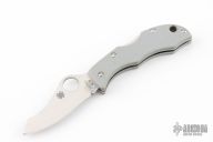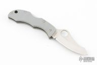 This Jester by Spyderco features a satin finished blade with thumbhole and notched thumbrest. The handle has grey G-10 scales, stainless steel liners and backspacer, lanyard hole. Comes with original box and papers. New condition.
