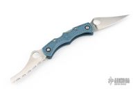 This Dyad Jr. by Spyderco features two satin finished blades, one is fully serrated and both have thumbholes. The handle has grey FRN scales, stainless steel liner and backspacers. Comes with box and papers. New condition.