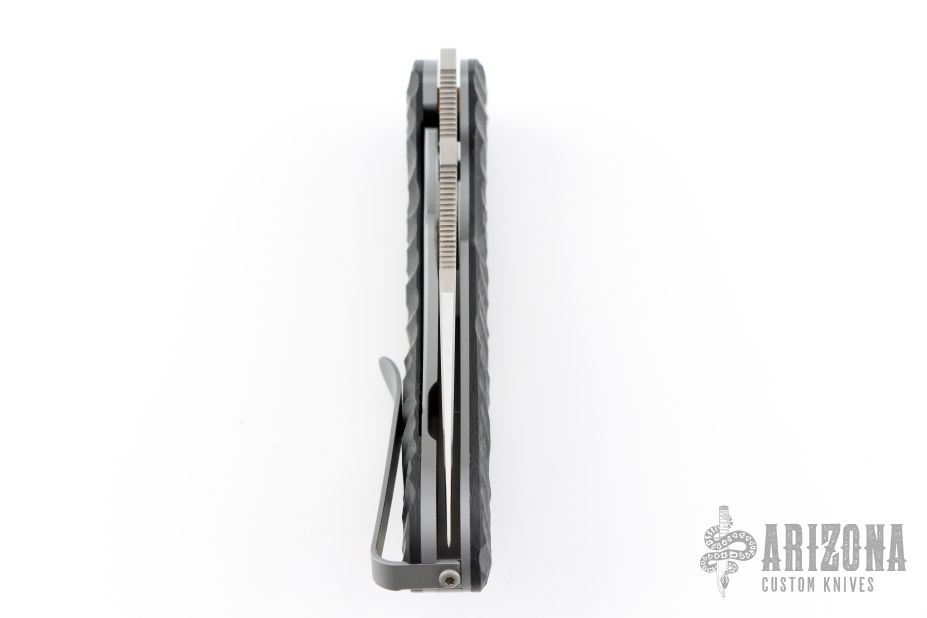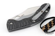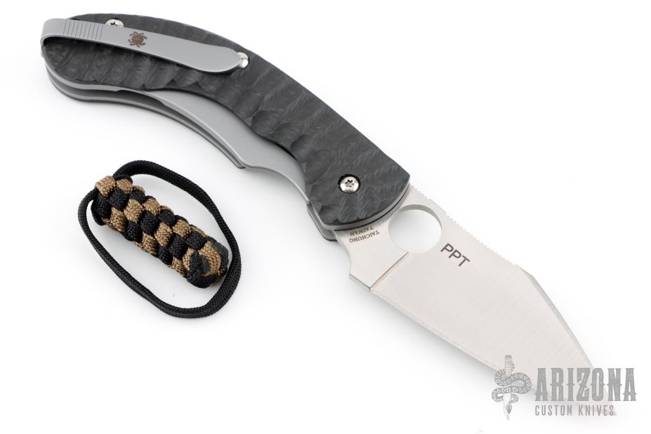 This Perrin PPT from Spyderco has a satin finished CPM S90V stainless steel drop point blade with thumb hole and notched thumb rest. Handle is carbon fiber over bead blasted stainless steel liners and backspacer. Bead blast stainless steel tip up clip. New condition. Includes original box and papers. Discontinued.