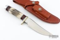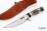 The Model 27 is an ideal all-around heavy-duty sportsman's knife. This knife has a satin finished blade with .201" blade stock and 1.348" blade depth, hidden tang construction. The handle has a nickel silver guard and duralumin butt, stag grip with stacked leather, black and duralumin spacers. Comes with a brown leather sheath. Excellent condition.