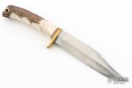 This Model 12-6 Sportsman Bowie from Randall Made Knives features a clip point bowie style blade with sharpened top edge, .210" blade stock and 1.258" blade depth, hidden tang construction. The handle is comprised of a brass guard, red/white/blue spacers and finger groove stag grip with lanyard hole. Has some light patina on the blade, otherwise excellent condition.