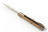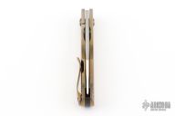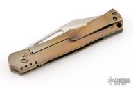 This Framelock by Kirk Mayberry of KM Designs features a satin finished blade with a thumbhole. The handle is comprised of an anodized titanium frame with a matching tip up clip. Lanyard hole in pommel. Comes with a zipper case. Has a couple light scratches, excellent condition otherwise.