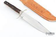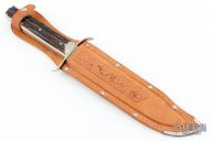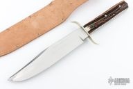 This bowie by Anton Wingen Jr was made for Othello features a mirror finished clip point blade with false top edge, .221" blade stock and 1.541" blade depth, full tang construction. The handle has a nickel silver guard, stag scales. Comes with original brown leather sheath. Has some light scratches, otherwise excellent condition.