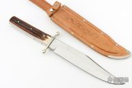 This bowie by Anton Wingen Jr was made for Othello features a mirror finished clip point blade with false top edge, .234" blade stock and 1.489" blade depth, full tang construction. The handle has a nickel silver guard, stag scales. Comes with original brown leather sheath. Has some light scratches, otherwise excellent condition.