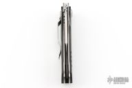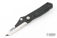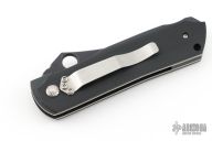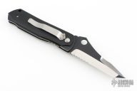 This linerlock folder by Allen Elishewitz features a two-tone black tanto blade with: partial serrations, thumb hole, and ramped thumb rest. The handle has black G-10 scales, bead-blasted and darkened titanium liners and a black G-10 backspacer, tip down stainless steel clip. Nice detent, lockup and blade seating. Comes with a zipper case. Has a couple light scuffs, otherwise excellent condition.