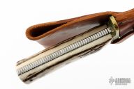 This knife by Morty the Knife Man features a satin finished blade with false top edge and notched thumbrest, .250" blade stock and 2.008" blade depth, full tang construction. The handle has a textured brass guard, stag scales, textured brass pins and a notched tang. Comes with a brown leather sheath. Excellent condition.