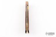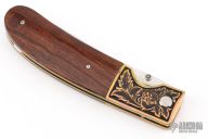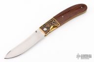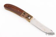 This Linerlock by Michael Walker features a hand rub satin finished blade with mirror polished flats, single checkered thumbstud. The handle has anodized and dovetailed titanium bolsters that have been engraved by Patricia Walker, desert ironwood scales, anodized titanium liners and backspacer. Nice lockup and blade seating, this knife was made before Michael invented the Detent. A-Side of the blade is marked "Walker's Lockers by ML Walker". Has a couple light scratches, otherwise excellent condition.