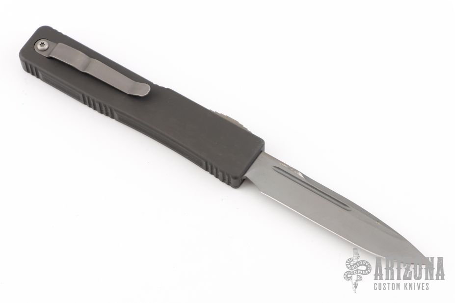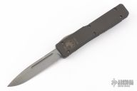 This Early Ultratech by Microtech Knives features a black tumbled drop point blade with swedge and fullers. The handle has a black anodized aluminum with ramped steel thumb slide and tip down clip. Has a couple very light scuffs, otherwise excellent condition. Includes original box and papers.  S/N 0436 and dated 09/2001.
