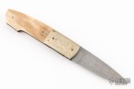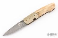 This liner-locking folder by Stan Fujisaka features a drop point Damascus drop point blade with a single thumb-stud. The handle has 3-alloy mokume dovetailed bolsters, mammoth ivory scales, and anodized titanium liners and back-spacer. Comes with a Velcro pouch. Excellent condition. This knife was made around June of 1991 based on the receipt from the original owner.