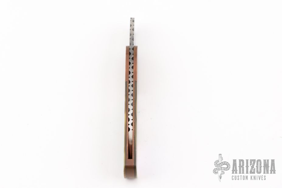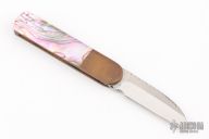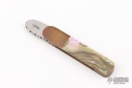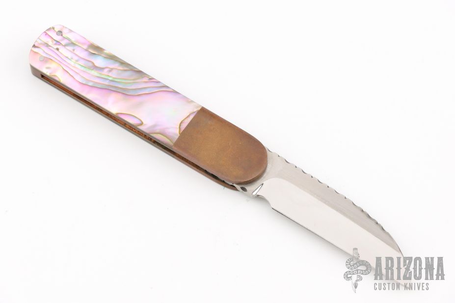 This Friction Folder by Robert White features a mirror polished blade with satin flats, fileworked spine and friction bar. The handle has copper dovetailed bolsters with integral liners, abalone scales, copper backspacer. Nice blade seating. Has some patina and scratches, otherwise good condition. Comes with a velcro case.