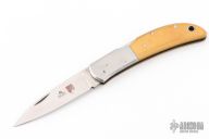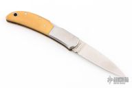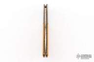 This knife by Al Mar features a satin finished blade with nail nick. The handle has stainless steel bolsters, yellow paper micarta scales, brass liners, and a stainless steel backspacer. Has some scratches and oxidation, otherwise good user condition.