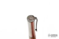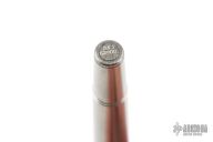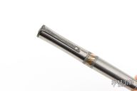 This custom titanium pen has mokume and damascus spacers, damascus end caps, and a damascus clip with white topaz inlay. Includes original box and certificate dated January 14, 2008. Excellent condition.