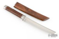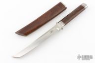 This Hambidashi Tanto by Leroy Besic features a hand rub satin finished blade with .189" blade stock and .877" blade depth, hidden tang construction. The handle has a stainless steel guard and fluted bolster and butt, cocobolo grip. Comes with a matching wooden scabbard with stainless steel throat. Excellent condition. Comes with an original Leroy Besic catalog. This knife was made in 1986.