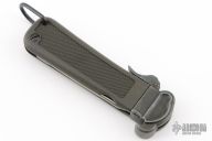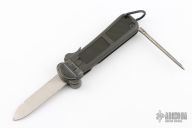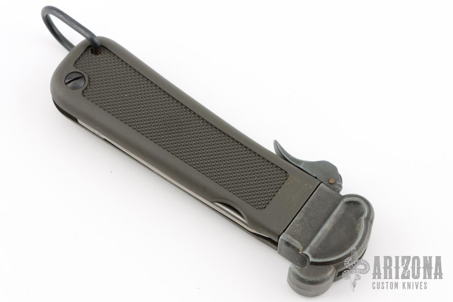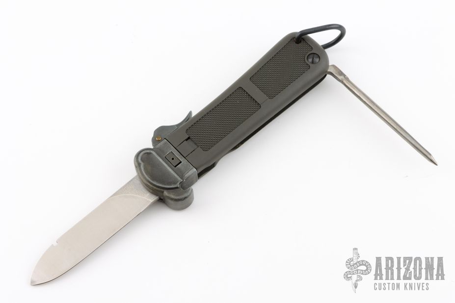 This Gravity knife features a satin finished blade. Blade deploys with gravity. The handle is black/green plastic with folding marlin spike. Has some minor wear on the handle and the blade appears unused, otherwise Excellent condition. Comes with a zippered case.