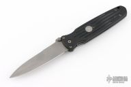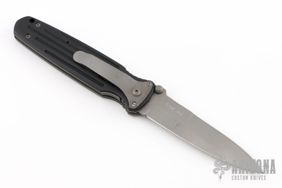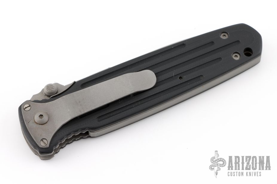 This Applegate Fairbairn Covert Auto by Butch Vallotton features a bead blasted spear point blade with false top edge, dual thumb studs and notched thumbrest. The handle has milled black G-10 scales over blasted titanium liners and stainless steel backspacer, bead blasted stainless steel tip down clip and lanyard hole in pommel. Stamped "99 #46" on "B" side of blade. Comes with a zippered case. Has some scuffs and scratches, otherwise good condition.