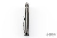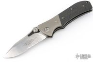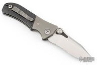 This MTX2 by Microtech features a satin finished partially serrated clip point blade with swedge, carbon fiber inset, dual thumb studs and notched thumbramp. The handle is comprised of blasted titanium bolsters and carbon fiber scales over blasted titanium liners and black polymer backspacer. The titanium tip up clip is positioned for right hand carry. Dated 06/2004 with a S/N of 0938. Comes with original box, sheath and papers. Has some light scuffs and scratches, great condition.