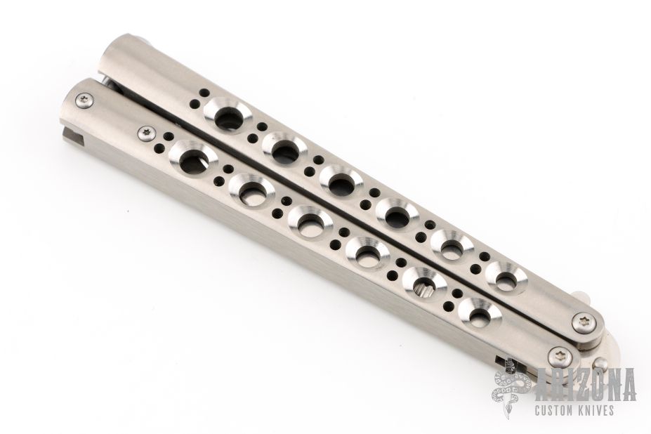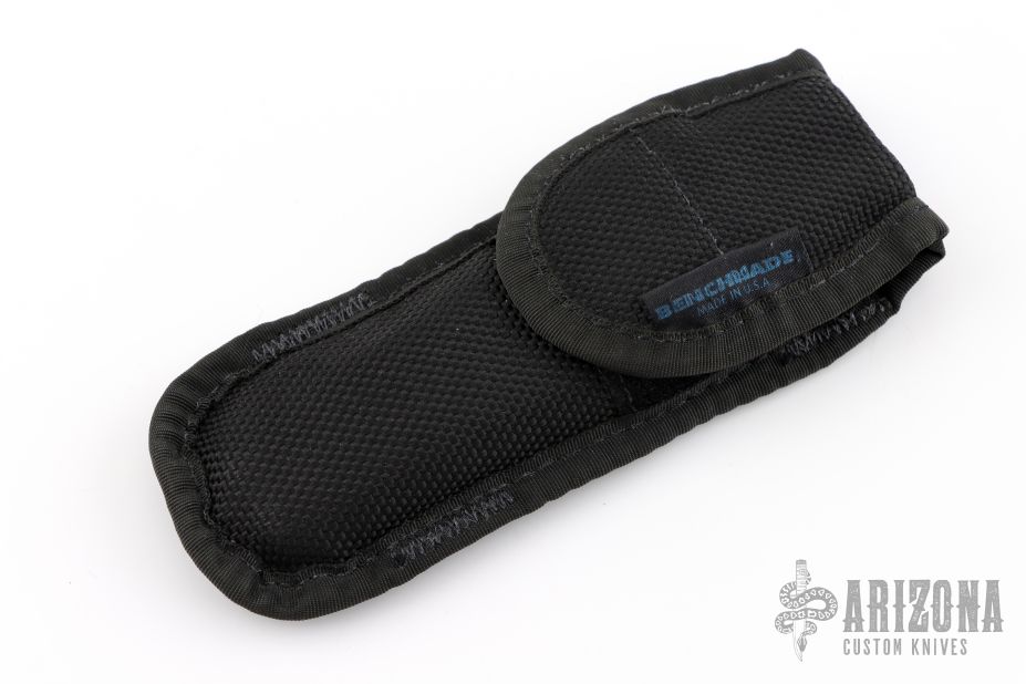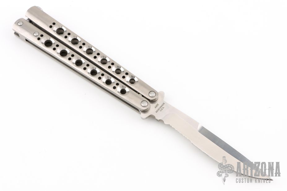 This Model 42S by Benchmade features a satin finished partially serrated blade. The handles are satin finished titanium with spring-latch. Excellent condition. Comes with original sheath. Comes with original box and papers.