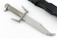 This Buckmaster 184 from Buck Knives has a bead blast blade with a sharpened and serrated top edge, has sawteeth on spine, .289" blade stock and 1.435" blade depth, hidden tang construction and a hollow knurled handle. Comes with original sheath. Has matches in the handle and a compass in the sheath. July-Sept 1985 Variation #3. Has scuffs, scratches, and patina. Good condition otherwise.