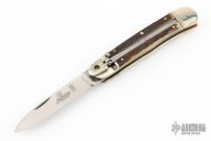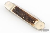 This leverlock auto by Hubertus features a mirror polished blade, nickel silver double bolsters, stag scales, nickel silver liners and brass pins. Opens with a nice snap. Very fast opening. Has some patina and some scuffs and scratches, great condition otherwise.