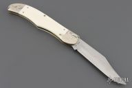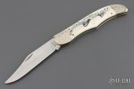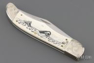 This Slipjoint by Case features a satin finished blade with nail nick. The handle has nickel engraved silver bolsters, scrimshawed bone covers, brass liners and stainless steel spring. Has some patina, otherwise Excellent condition. #330 on the blade.