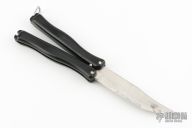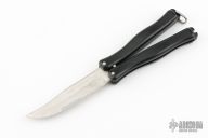 This Vintage CIA Balisong by Hackman has a satin finished stainless steel clip point blade. Handle is black polymer with O-latch at butt. Has some scratches, otherwise good condition.