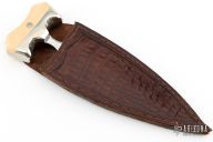 This extra large push dagger by David Grant features a double edged mirror polished finish blade, .244" blade stock, 1.891" blade depth. Full tang construction with nickel silver bolsters, and mammoth scales. Comes with a leather sheath. Has some scuffs and patina, great condition otherwise. #218
