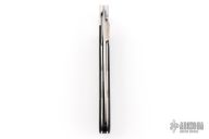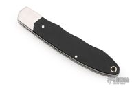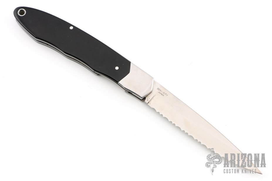 This Spyderco Solo 2000 Micarta Gentleman's Knife. It has a satin finished fully serrated blade with thumb lug. The handle has stainless steel bolsters and liners, black paper micarta scales. Has some scratches, otherwise good condition. Rare. Comes with a leather pouch.