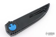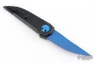 This Phoenix model sports a black handle with a phoenix laser etching and a CPM-S30V steel blade with a blue cerakote finish. The top edge of the knife has been sharpened and serrated.