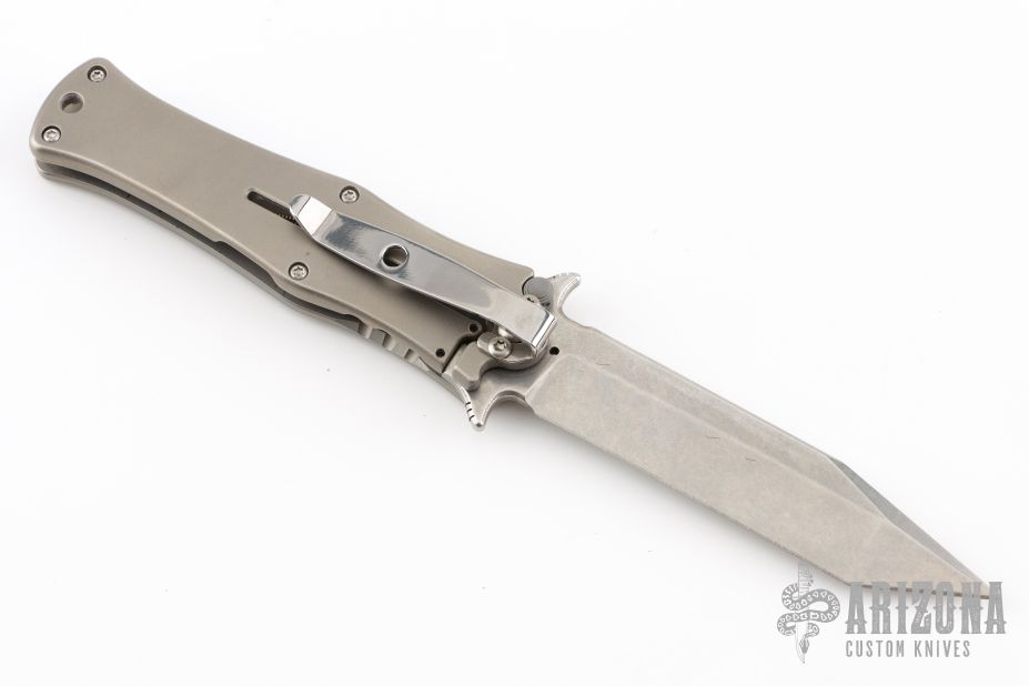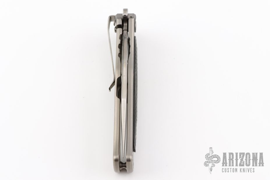 This Madd Maxx 4" Assisted Flipper is a Darrel Ralph Design executed by HTM Knives. It features a stone wash finished tanto blade with false top edge, fullers, dual thumb studs and flipper. The handle is comprised of a bead blast finished titanium frame with carbon fiber overlay over barrel spacers. Black coated steel tip down clip and lanyard hole in pommel. Includes padded and zippered case, original box and papers. Has a couple light scuffs, otherwise excellent condition.