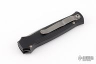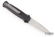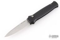 The Bodyguard side opening auto by Piranha Knives features a blasted finish bayonet blade, ribbed aircraft aluminum handle, and titanium pocket clip. Fires smoothly. Strong action and good lockup. Has a couple light scuffs, otherwise excellent condition.