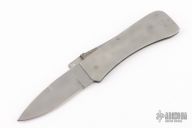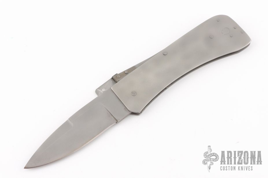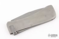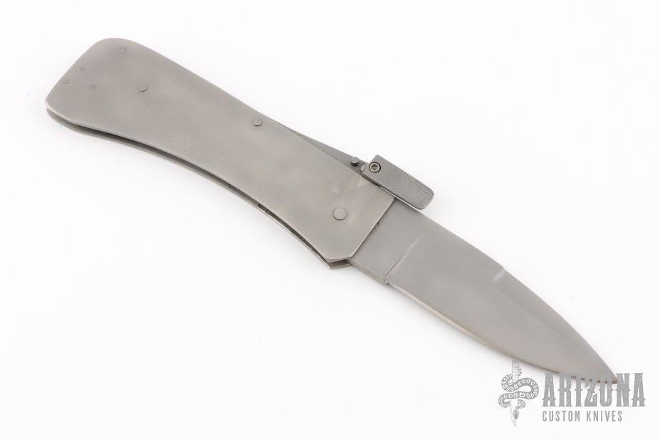 This auto (please let us know if you know who made this) features a bead blasted blade with false top edge. The handle has a bead blasted stainless steel frame, has a checkered tab to fire and close the knife. Pull the tab back to release the lock. Has nice action and blade seating. Has some scuffs and scratches, otherwise good condition. Comes with a felt pouch.