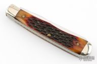 This Knife by Canal Cutlery features polished blades with nail nicks. The handle has nickel silver bolsters, jigged bone covers with fileworked brass liners, brass liners and stainless steel springs. Has some light scratches, otherwise excellent condition. Comes with original sales receipt.