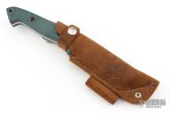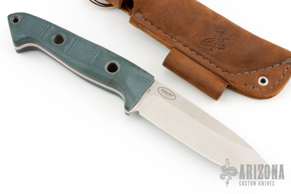 This Bushcrafter from Benchmade features a drop point tumble finished blade with .165" blade stock and 1.156" blade depth, full tang construction. The handle has a green G10 scales over red liners and full tang construction with hollow pins and a lanyard tube with lanyard. Includes leather sheath with a belt loop.  Excellent Condition.