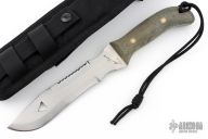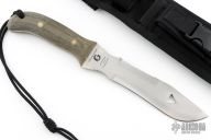 This Mel Parry Survival knife was made under Samuel Staniforth Sheffield England, it features a hand rub satin finished blade with .152" blade stock and 1.508" blade depth full tang construction. The handle has green canvas micarta scales. Comes with a nylon belt sheath. Has some light scuffs, otherwise excellent condition.