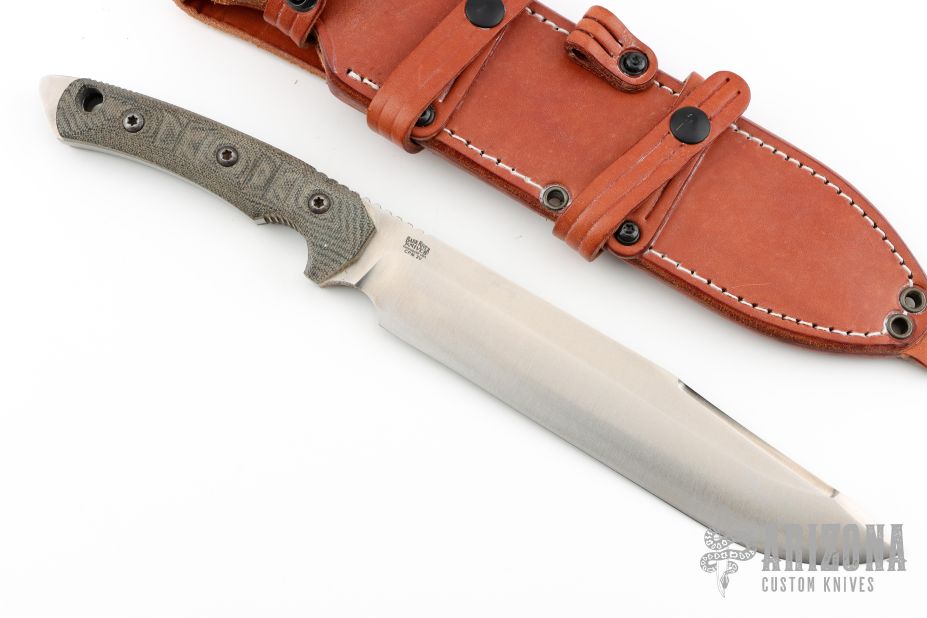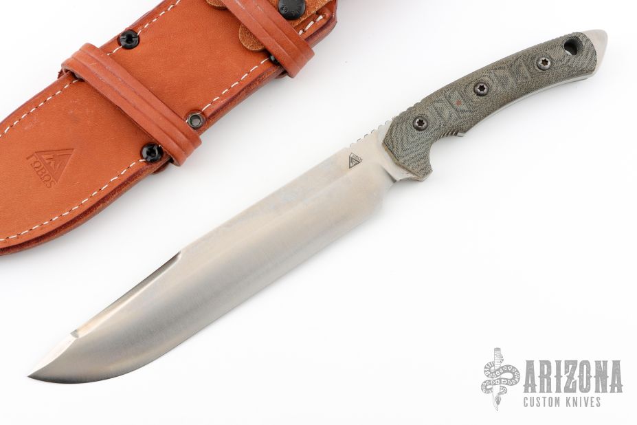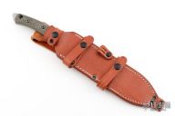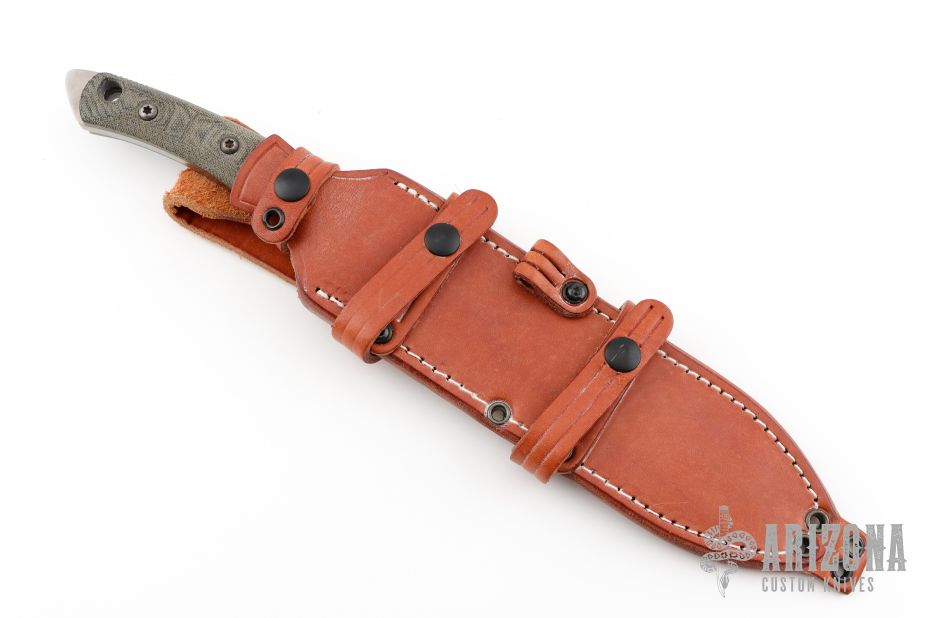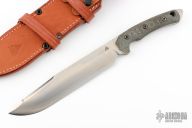 This knife from Bark River features a satin finished blade with false top edge, .248" blade thickness and 1.569" blade depth, full tang construction. The handle has OD Green canvas micarta scales with lanyard hole. Comes with a leather sheath. Excellent condition.