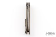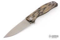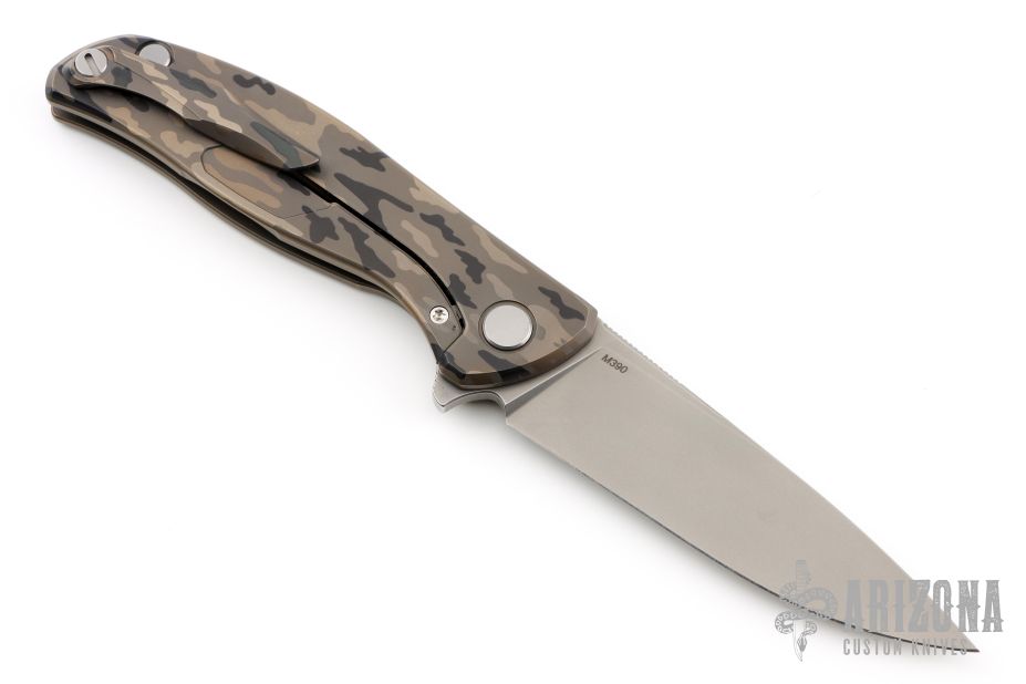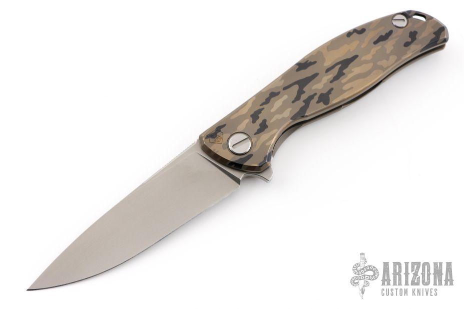 This Model 95 Camo framelock flipper from Shirogorov has a flat ground and tumbled blade with a notched thumbrest and flipper. The handle has a CAMO titanium frame with matching tip up clip. Excellent lockup, detent, and blade seating. Comes with original box and COA. Excellent condition.