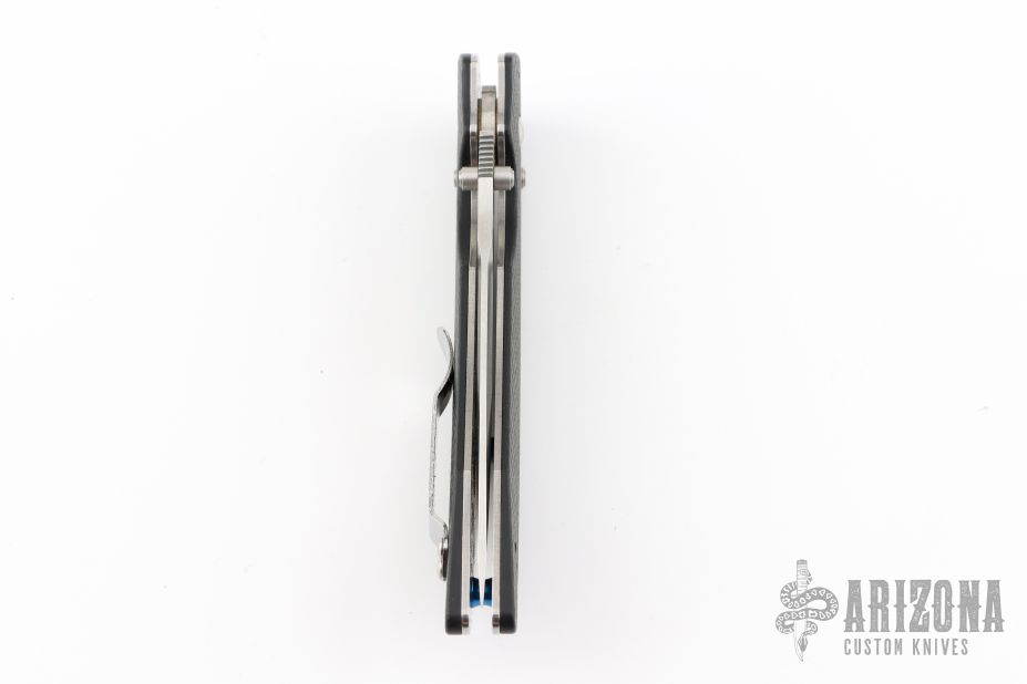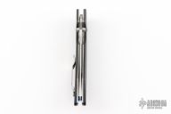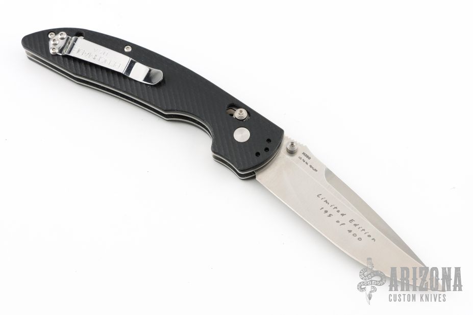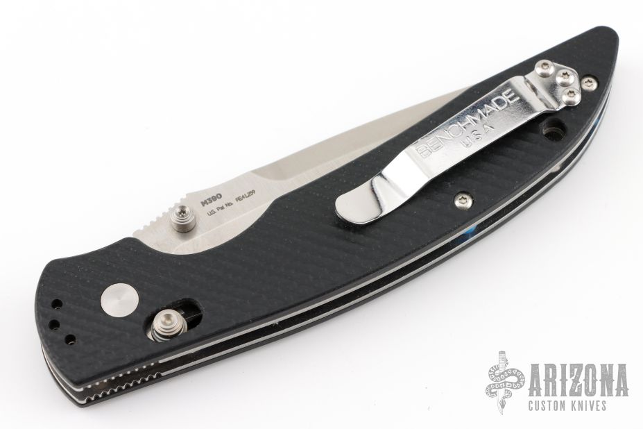 This 805BK TSEK from Benchmade is features a stonewash finished drop point blade with swedge, notched thumb ramp and dual thumbstuds. The handle is comprised of textured black G10 over steel liners and blue anodized barrel spacers. Stainless steel tip up clip. Includes original box, drawstring pouch and papers. Has a couple light scuffs, otherwise excellent condition.